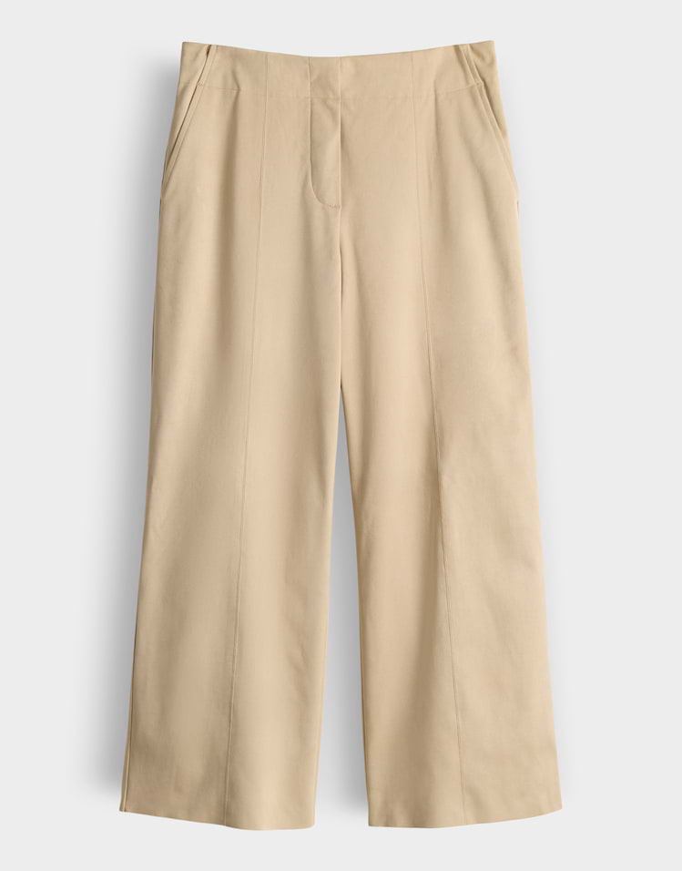 Enkellange broek van Someday in een suède look met wijde pijpen, verborgen knoop- en ritssluiting, gestikte middennaad, steekzakken, twee paspelzakken en een elastische tailleband aan de achterzijde. Materiaal: Polyester 92%| elastan 8%