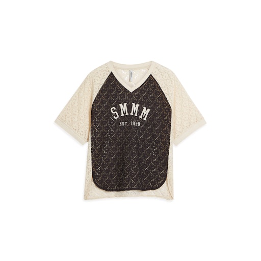 Kanten shirt van Summum met korte raglanmouwen, V-hals en een contrasterende voorzijde voorzien van tekstprint. Materiaal: Polyester 100%
