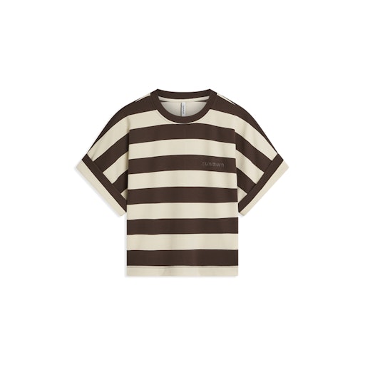 Boxy gestreepte top van Summum met een ronde hals en korte aangeknipte mouwen voorzien van omslag. Materiaal: Viscose 82%| polyester 16%| elastan 2%