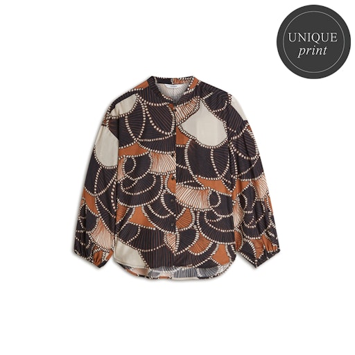 Ruimvallende blouse van Summum in een licht transparante stof met een all-over dessin, driekwart mouwen voorzien van elastische boorden, verlaagde schoudernaden, knoopsluiting, zijsplitten en boordkraag. Materiaal: Viscose 52%| katoen 48%