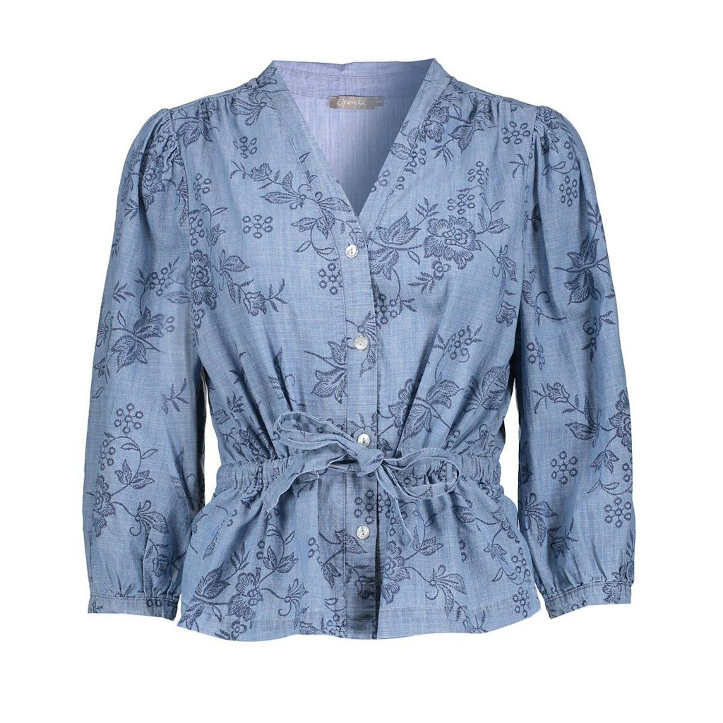 Chambray blouse van Geisha voorzien van een bloemen print met verkorte pofmouwen, V-hals, knoopsluiting en een trekkoord in de taille. Materiaal: Katoen 100%