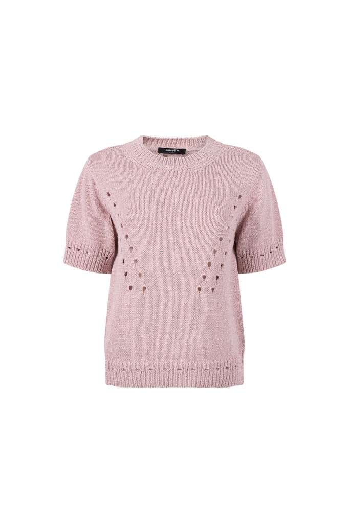 Open gebreide trui van Jansen Amsterdam met een subtiele lurexdraad, korte mouwen en ronde hals. Materiaal: Katoen 77%| metallic 23%