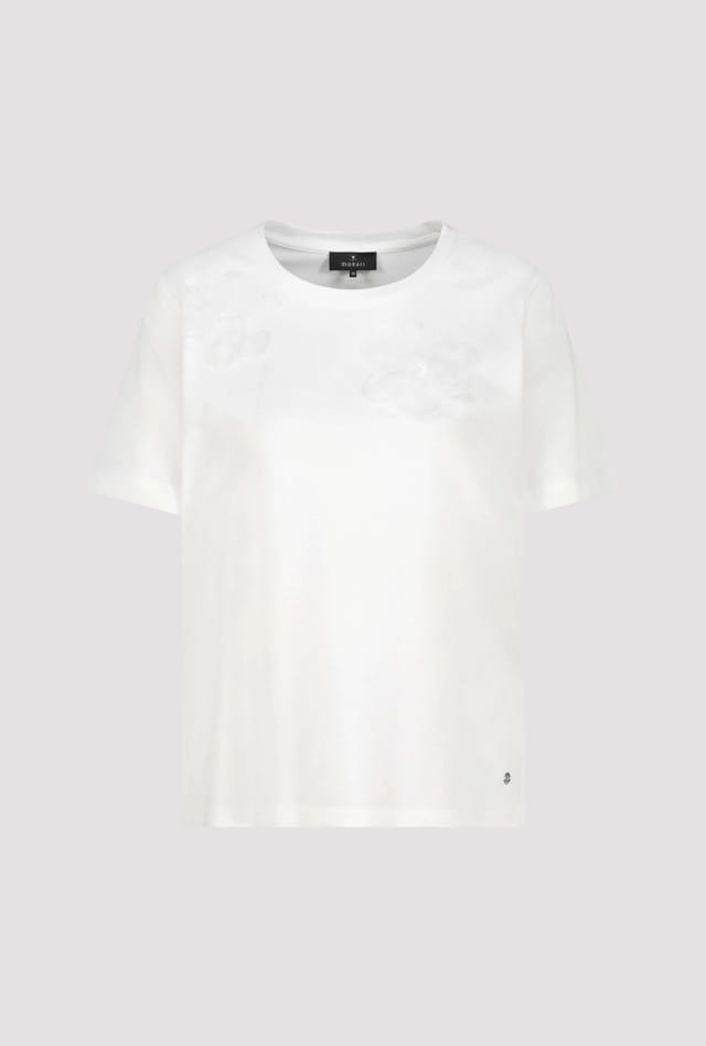 T-shirt van Monari met korte mouwen, ronde hals en 3D-bloem applicaties op de borst. Materiaal: Katoen 50%| modal 50%