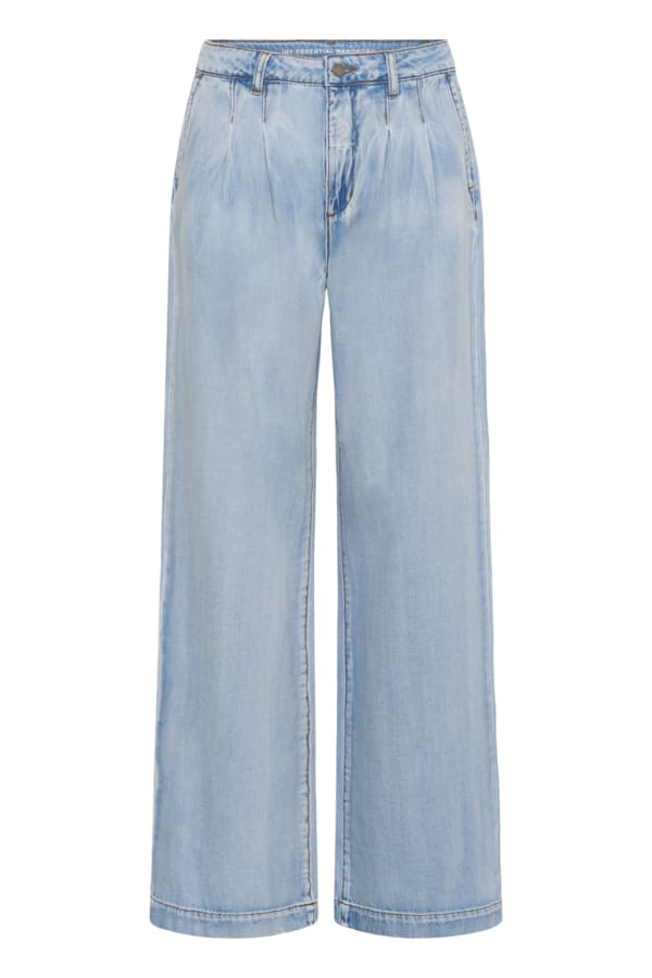 Jeans van Essential Wardrobe met wijde pijpwen, knoop- en ritssluiting, bandplooien, steekzakken en twee paspelzakken aan de achterzijde.