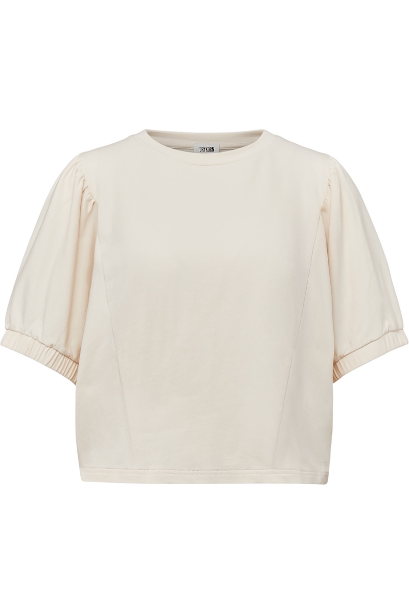 Jersey shirt van Drykorn met bijzondere deelnaadjes en plooien, korte pofmouwen en een ronde hals. Materiaal: Katoen 95%| elastan 5%