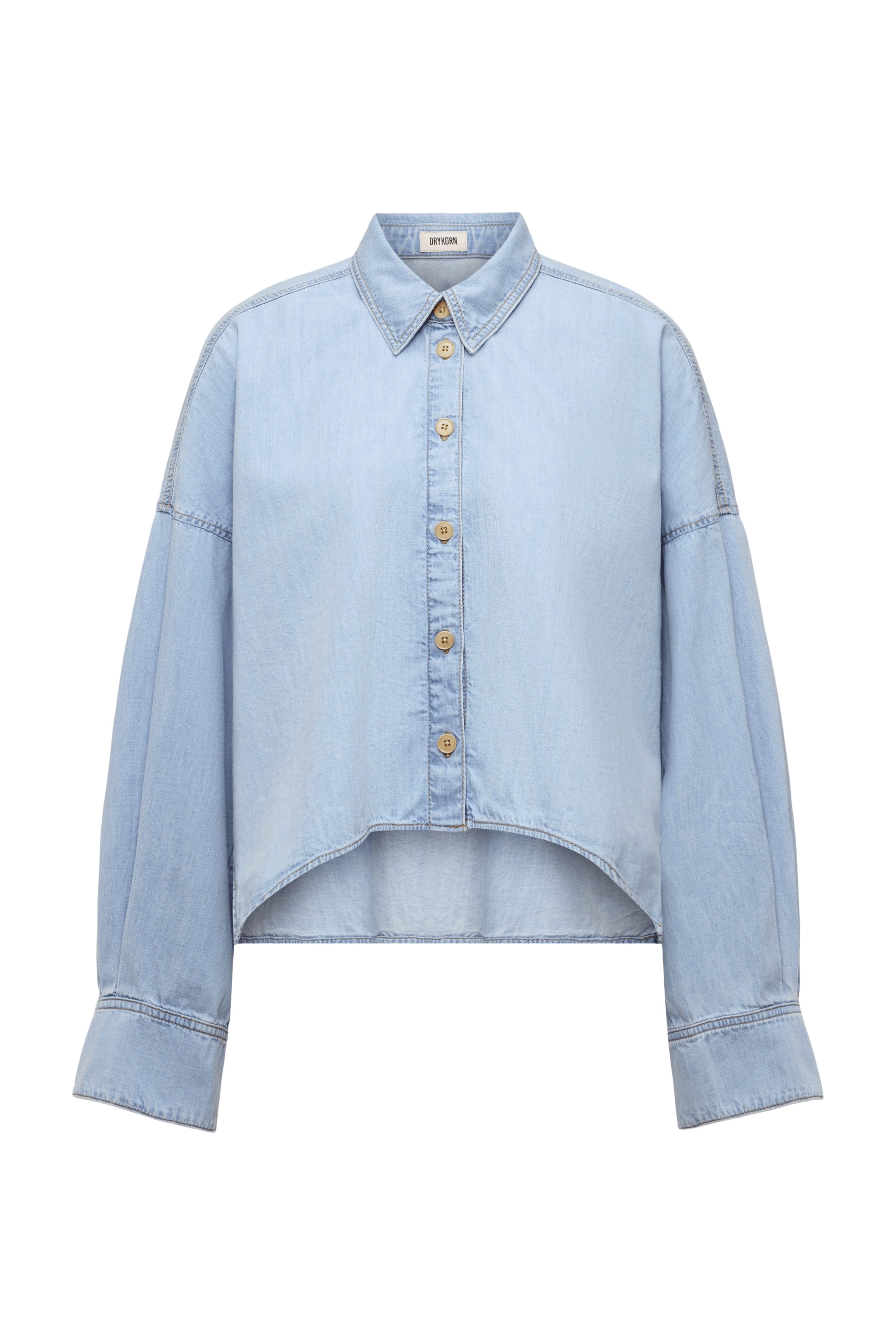 Oversized lichte denim blouse van Drykorn met lange mouwen, verlaagde schoudernaden, kraag, knoopsluiting, zijsplitten en een iets langere achterzijde.