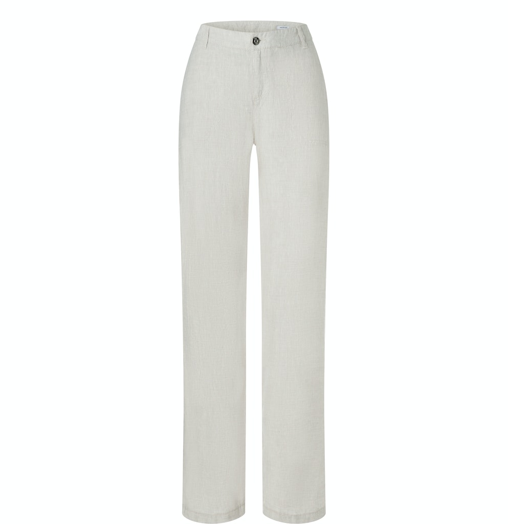 Linnen broek van MAC met wijde pijpen, knoop- en ritssluiting, steekzakken en opgestikte achterzakken. Materiaal: Linnen 100%