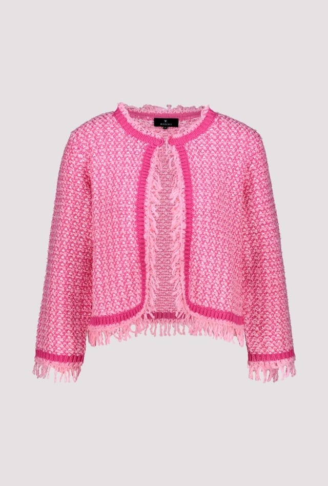 Tweed vest van Monari met franjes, driekwart mouwen, ronde hals en haak- en oogsluiting aan de bovenzijde. Materiaal: Katoen 62%| acryl 23%| polyamide 15%