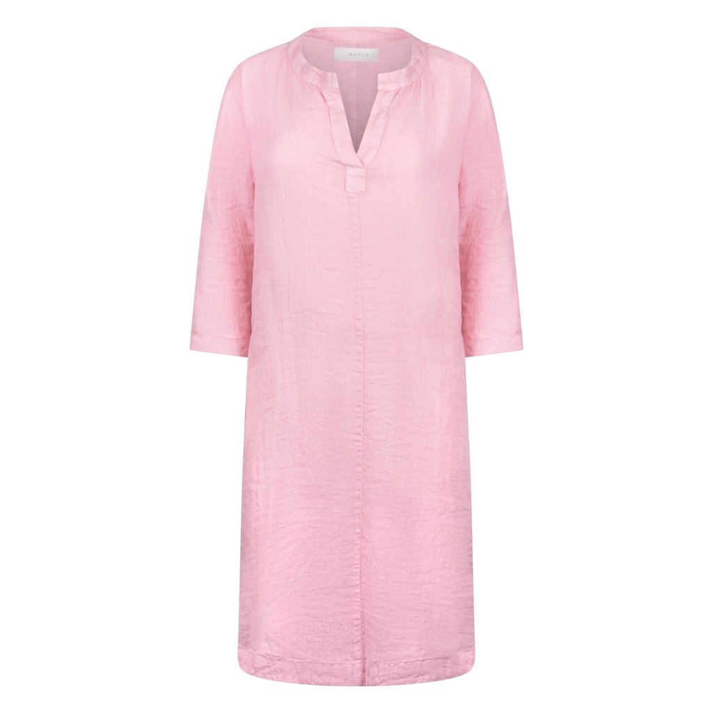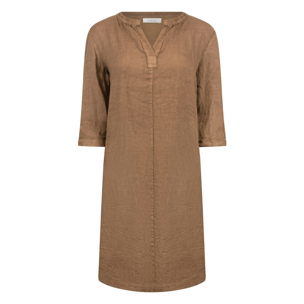 Linnen jurk van Nukus met driekwart mouwen voorzien van omslag, V-hals en een afgeronde zoom. Materiaal: Linnen 100%