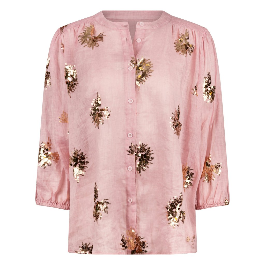 Blouse van Nukus met pailletten applicaties, lange mouwen voorzien van elastische boorden, ronde hals en knoopsluiting. Materiaal: Ramie 100%