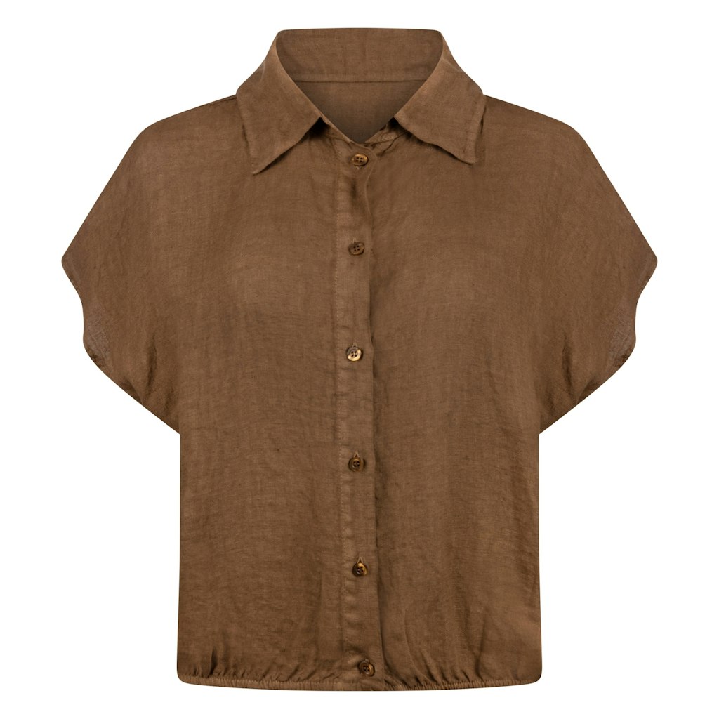 Linnen blouse van Nukus met korte aangeknipte mouwen, kraag, knoopsluiting en een elastische zoom. Materiaal: Linnen 100%
