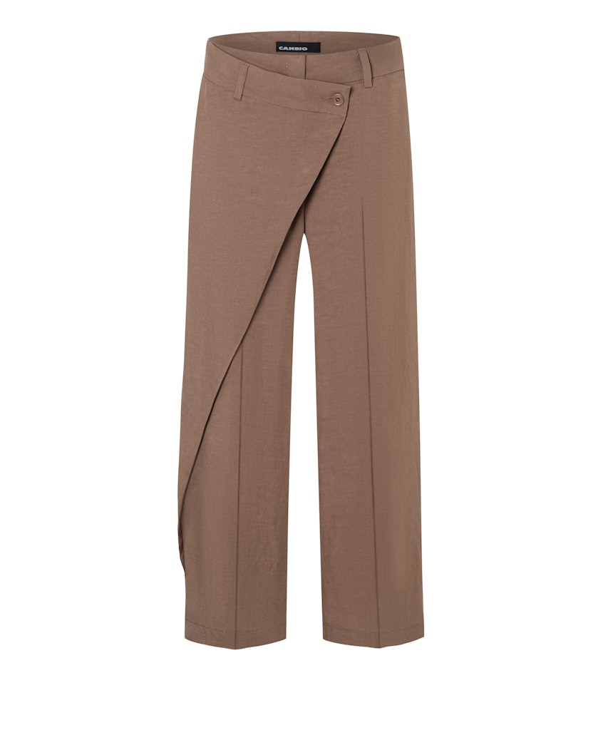 Enkellange linnen broek van Cambio met wijde pijpen, knoop- en ritssluiting voorzien van een overslag en twee paspelzakken aan de achterzijde. Materiaal: Linnen 65%| katoen 34%| elastan 1%