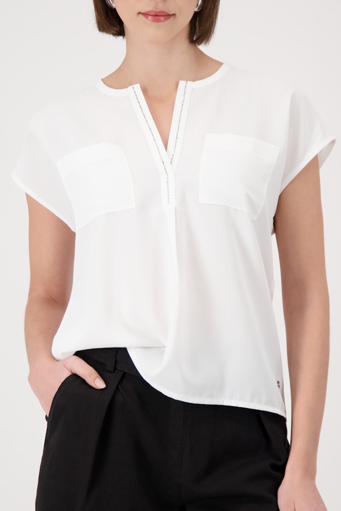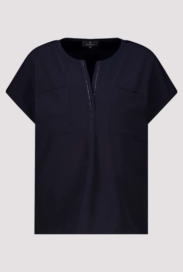 Blouse van Monari met korte mouwen en een ronde hals met V-uitsnede voorzien van strass steentjes en opgestikte borstzakken. Materiaal: Polyester 100%