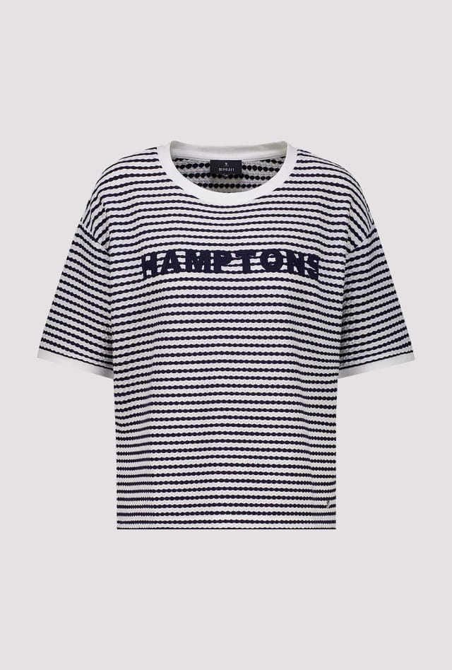 Gestreept shirt van Monari in structuurstof met korte mouwen, ronde hals en opschrift aan de voorzijde. Materiaal: Polyester 47%| katoen 27%| viscose 23%| elastan 3%