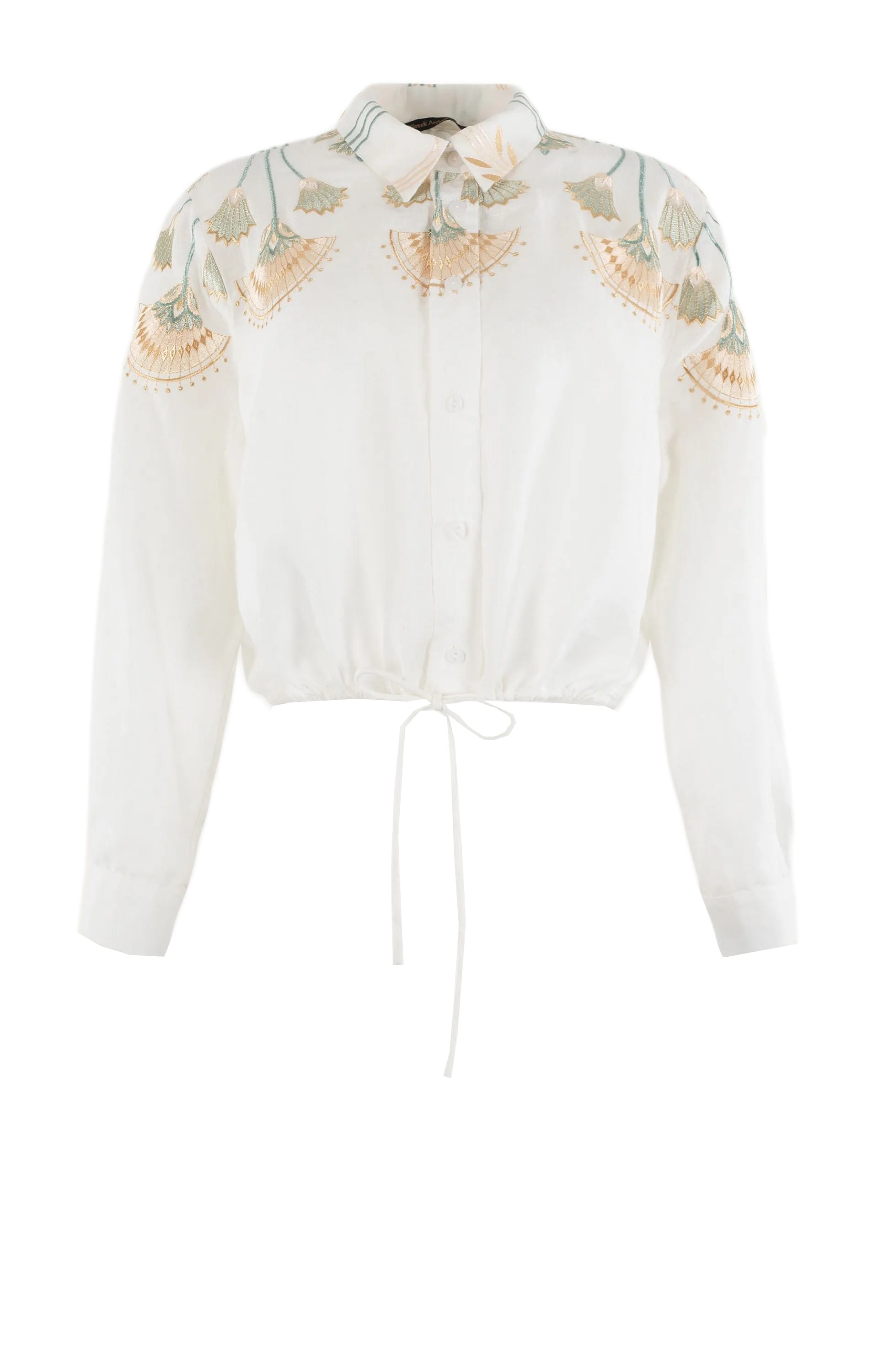 Linnen blouse van Greek met borduursels, lange mouwen, kraag, knoopsluiting en tunnelkoord aan de onderzijde. Materiaal: Linnen