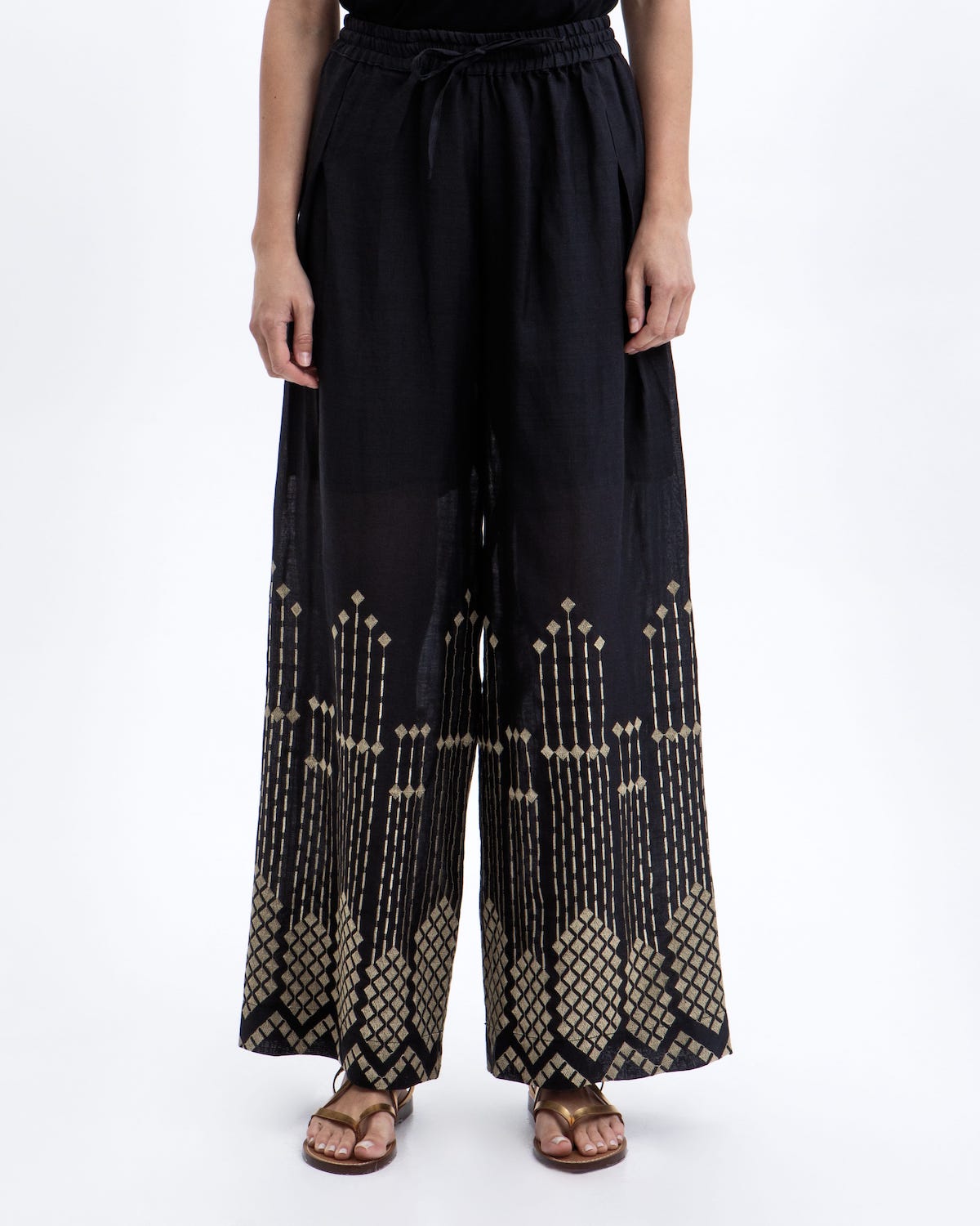 Linnen broek van Greek met borduursels, wijde pijpen en een elastische tailleband voorzien van trekkoord. Materiaal: Linnen