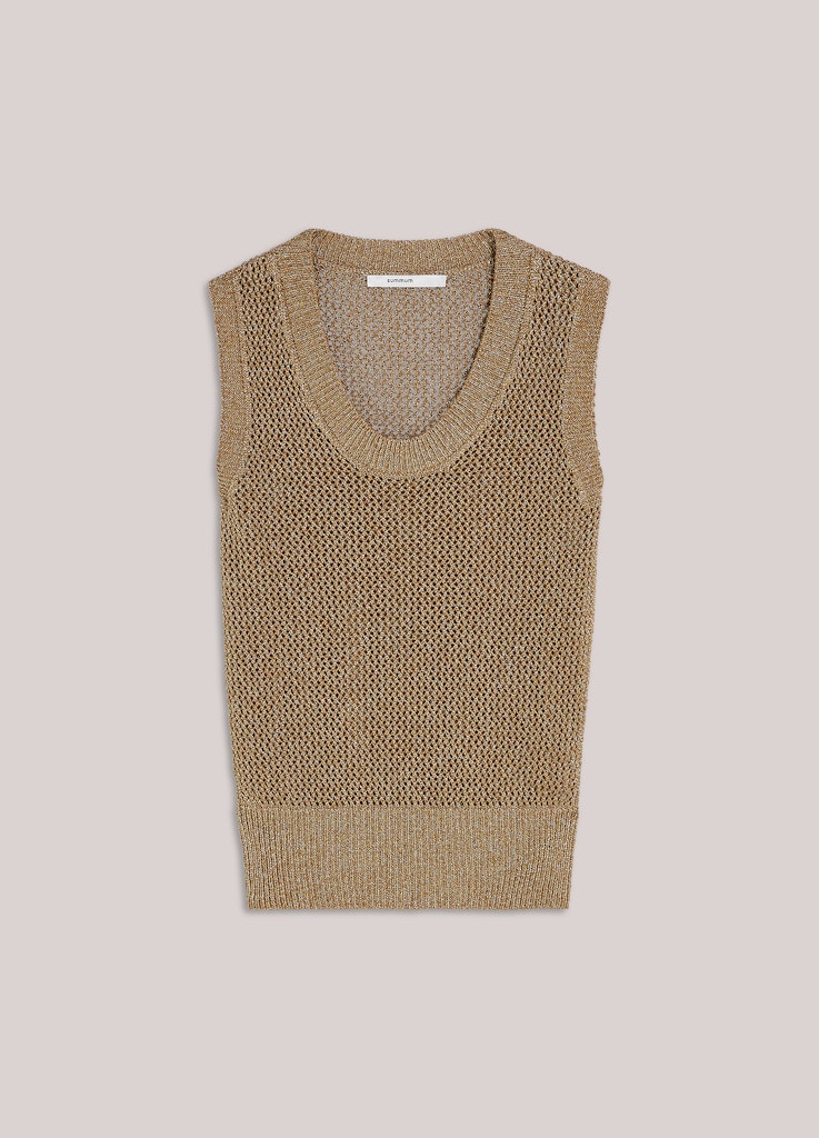 Mouwloze, gebreide top van Summum met een subtiel lurexdraadje in een honingraatsteek, ronde hals en brede ribboorden. Materiaal: Viscose 80%| metallic 20%