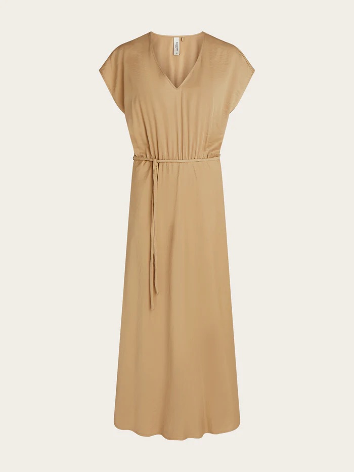 Soepelvallende jurk van Beaumont in een matte satijn-look met korte aangeknipte mouwen, V-hals, diagonaal gesneden rok en een strikceintuur in de elastische taille. Materiaal: Viscose 56%| polyester 33%| polyamide 11%