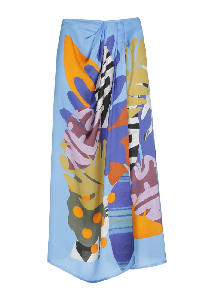 Zomerse midi rok van Caroline Biss in een all-over dessin met drappage effect aan de voorzijde en een blinde ritssluiting aan de achterzijde.