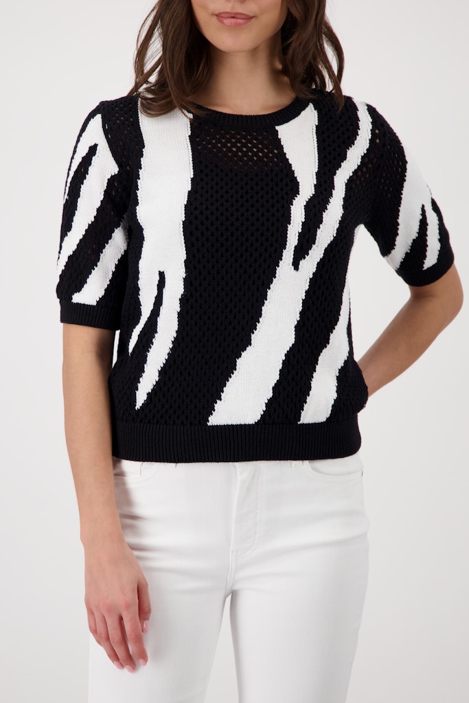 Ajour gebreide trui van Monari in een animal dessin met korte mouwen, ronde hals en ribgebreide boorden. Materiaal: katoen 100%