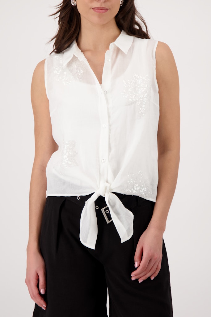 Mouwloze blouse van Monari voorzien van paillettenborduursels met een kraag, knoopsluiting en een knoopdetail aan de zoom. Materiaal: Ramee 55%| lyocell 45%