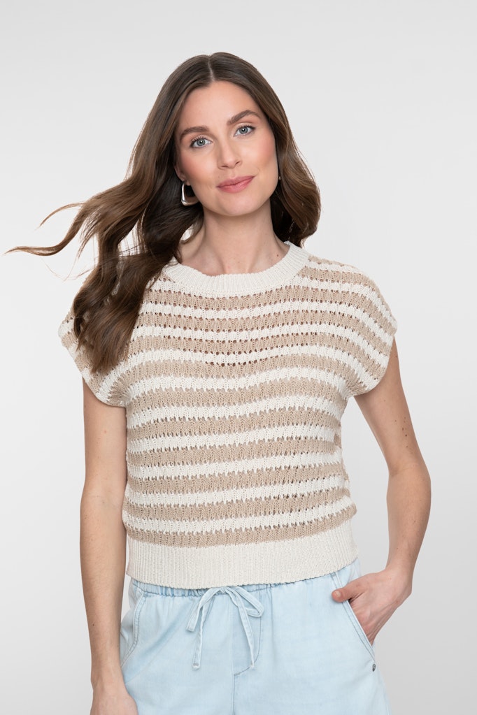 Gestreepte, ajour gebreide trui van Geisha met korte mouwen en ronde hals. Materiaal: Katoen 50%| acryl 50%