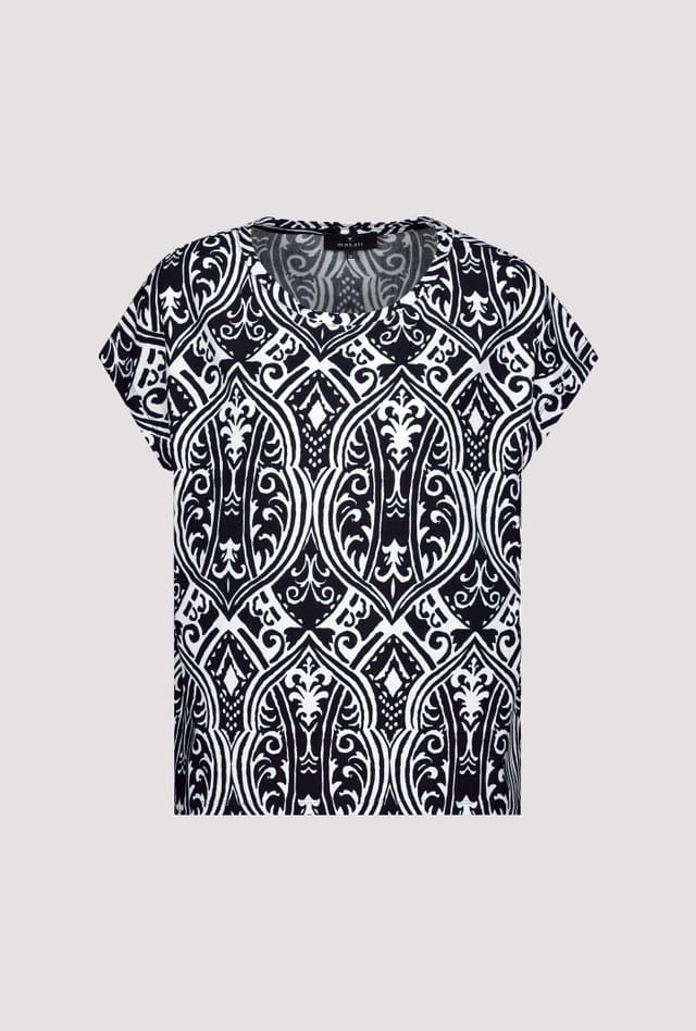 T-shirt van Monari in een all-over dessin met korte mouwen en ronde hals. Materiaal: Viscose 95%| elastan 5%