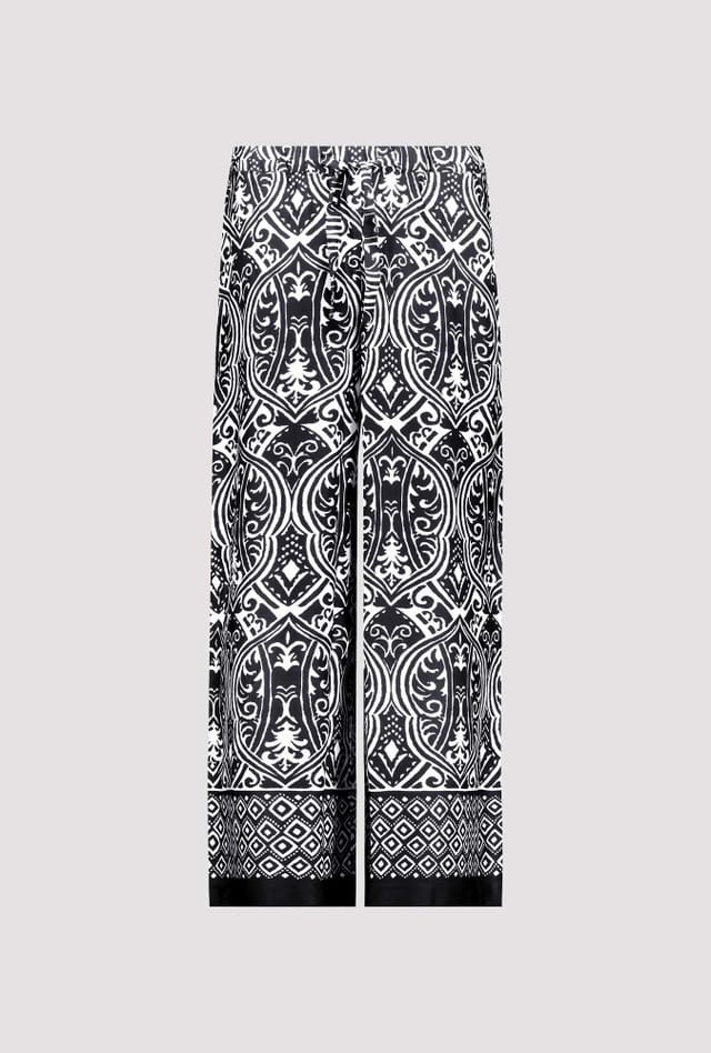 Palazzo broek van Monari in een all-over dessin met een elastische tailleband voorzien van strikkoord en steekzakken. Materiaal: Viscose 100%