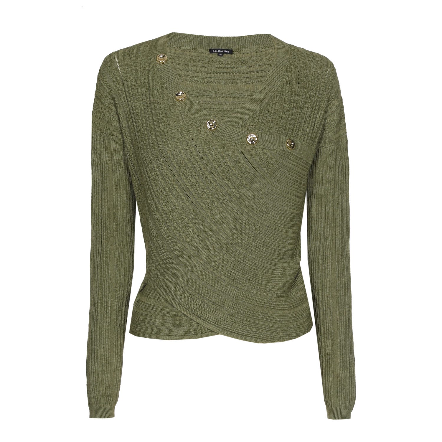 Trui van Caroline Biss in een ribstructuur met lange mouwen en een V-hals voorzien van overslag en knoopdetails.