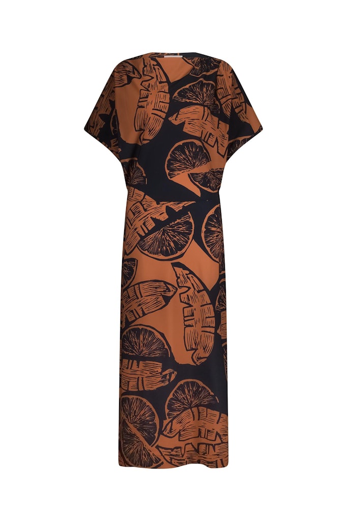 Jurk van Studio Anneloes in travel kwaliteit met sinaasappel print, asymmetrische halslijn, korte aangeknipte mouwen en een split aan de voorzijde. Materiaal: Polyamide 75%| elastan 25%