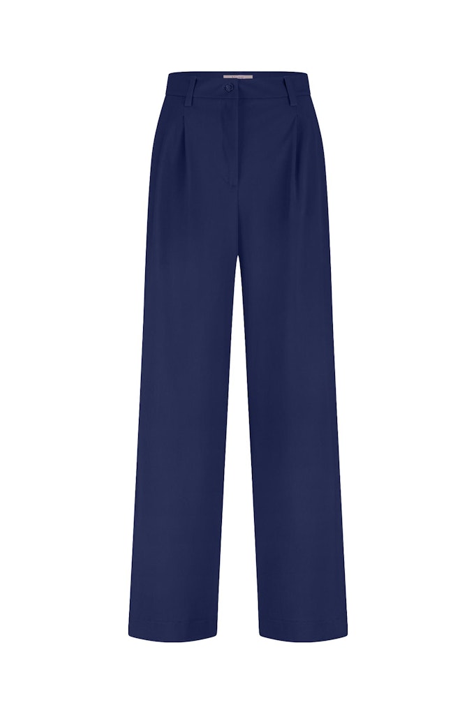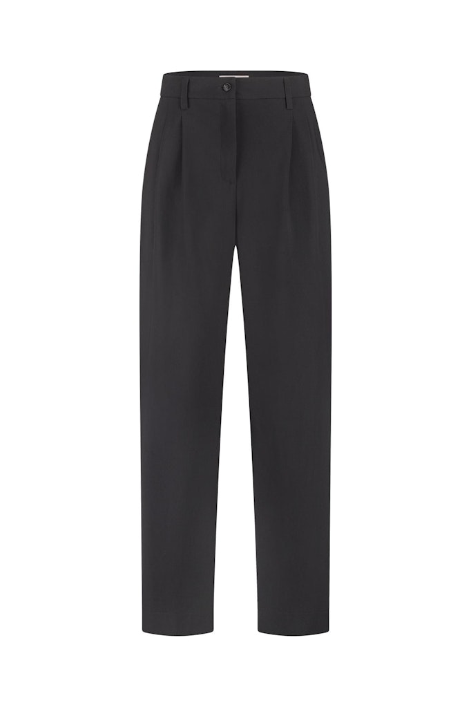 Broek van Studio Anneloes in travel kwaliteit met wijde pijpen, knoop- en ritssluiting, bandplooien, steekzakken en een paspelzak aan de achterzijde.