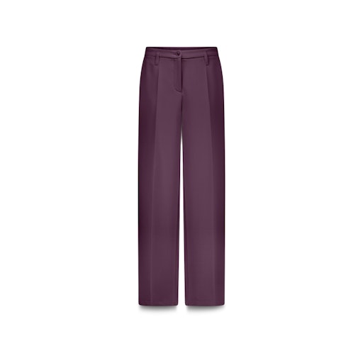 Broek van Summum met wijde pijpen, knoop- en ritssluiting, steekzakken, twee paspelzakken, persnaad aan de voorzijde en een elastische tailleband aan de achterzijde. Materiaal: Polyester 71%| viscose 22%| elastan 7%