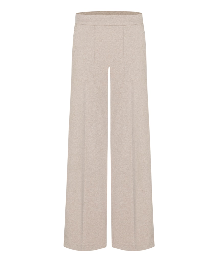 Gemêleerde broek van Cambio met wijde pijpen, pintucknaad aan de voorzijde, steekzakken, twee paspelzakken aan de achterzijde en een elastische tailleband.