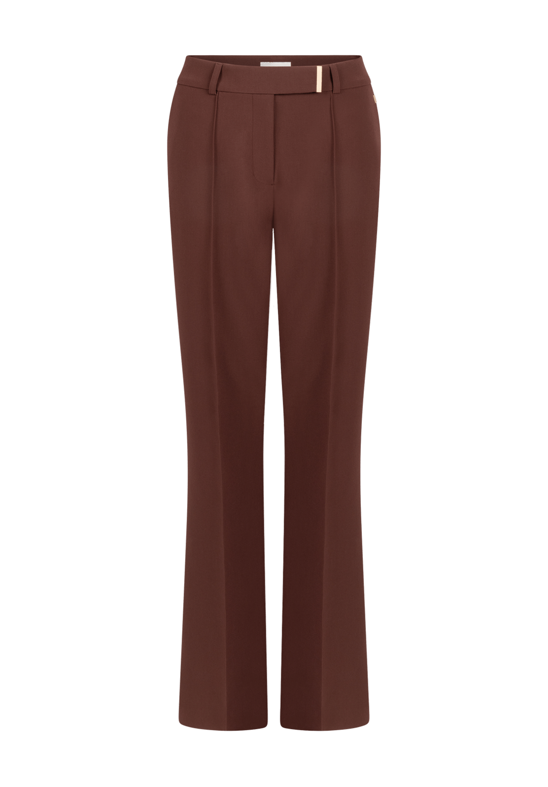 Broek van Aaiko met een verborgen knoop- en ritssluiting, wijde pijpen, persnaad aan de voorzijde, steekzakken en paspelzakken aan de achterzijde.